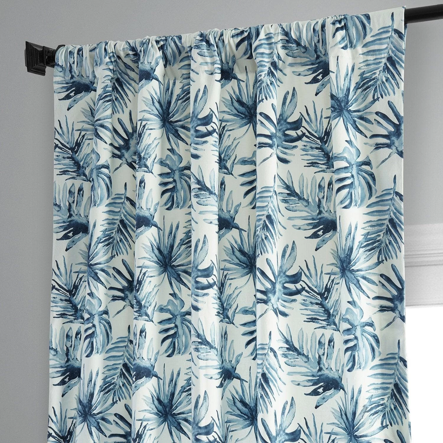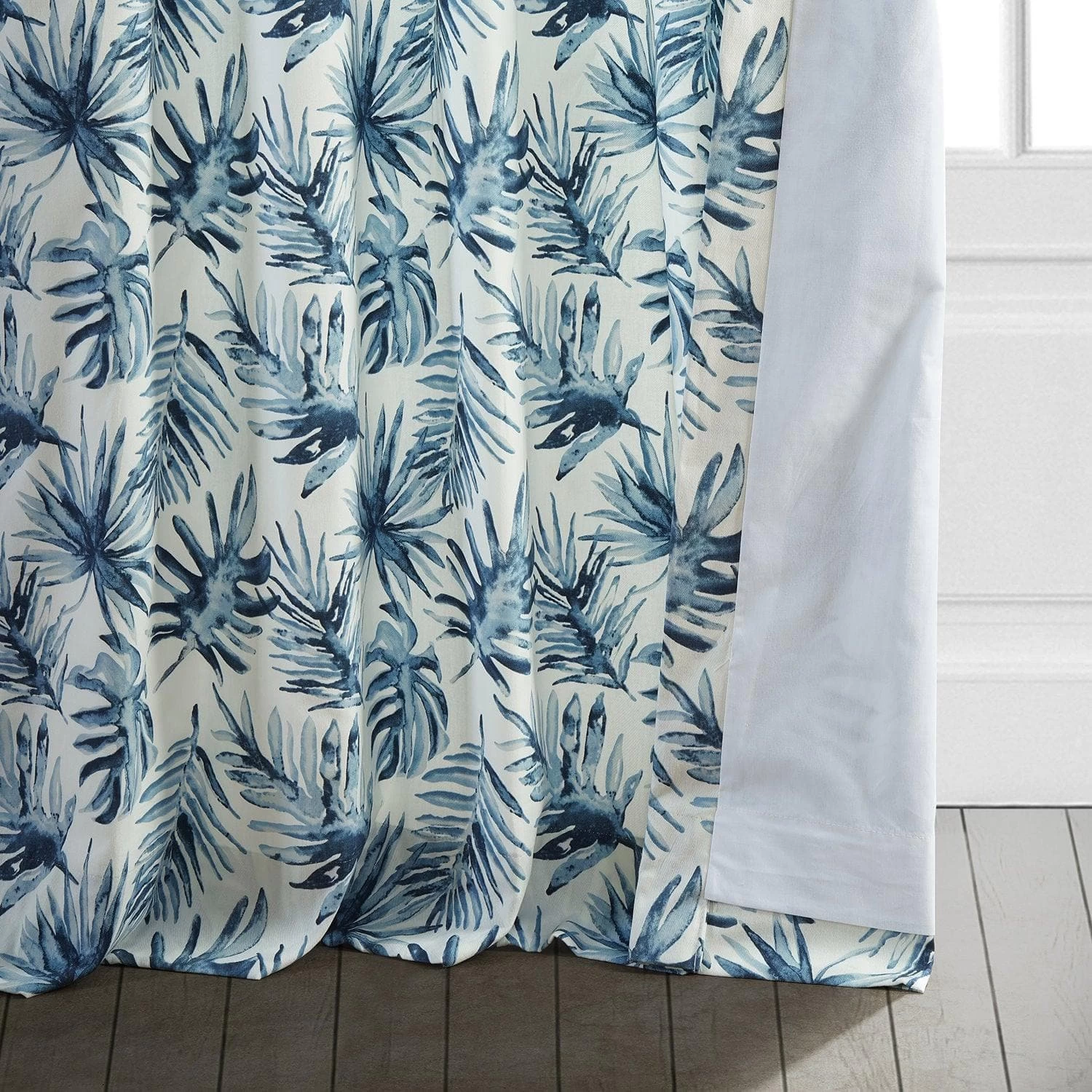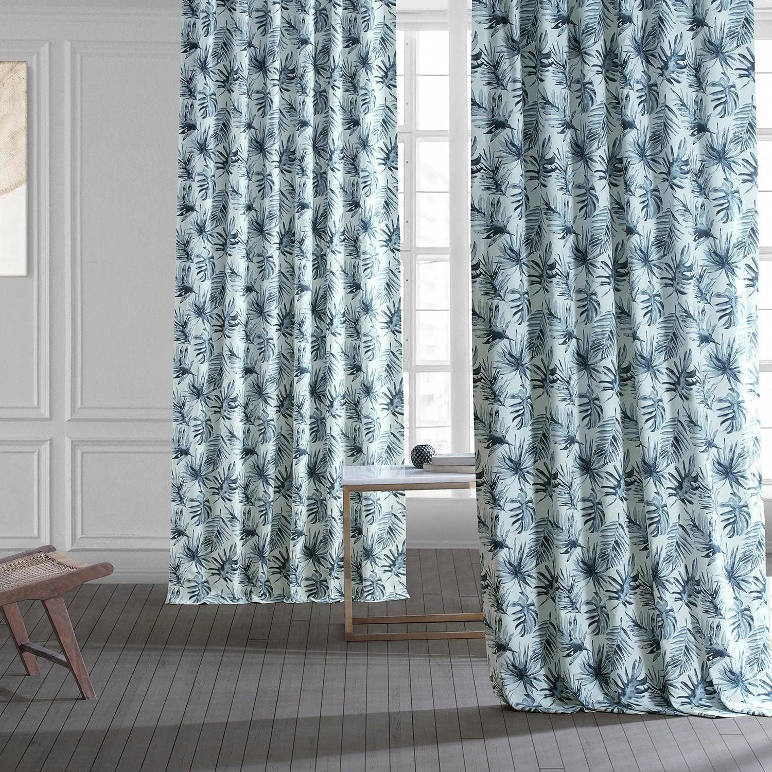 Artemis Blue is a soft light twill drape & curtain, fully lined and an inspired decorative backdrop to any space for any goddess. A tossed palm leaf inspired print in watercolor tints of aqua, teal and blue like the sea. The light blue color background is barely there and just enough for an overall cool tone.