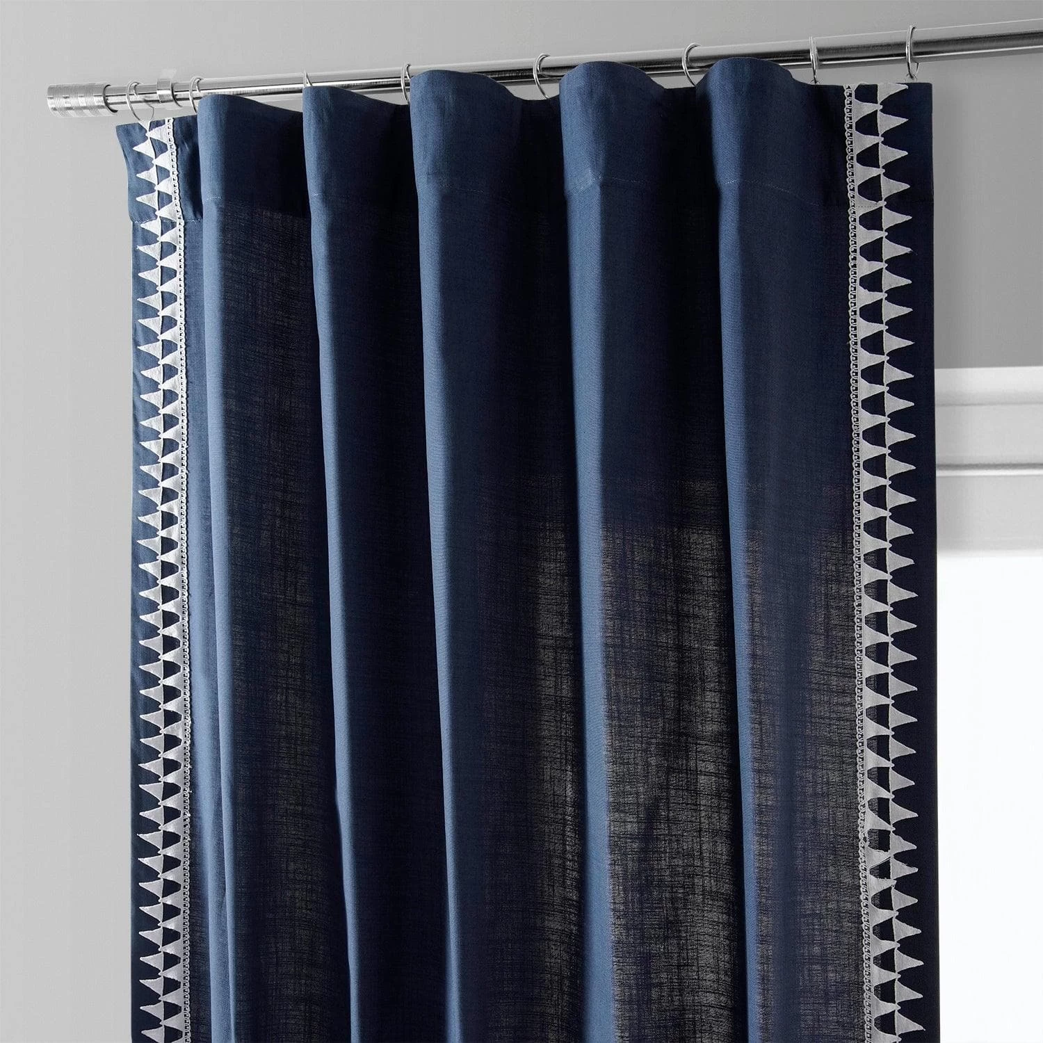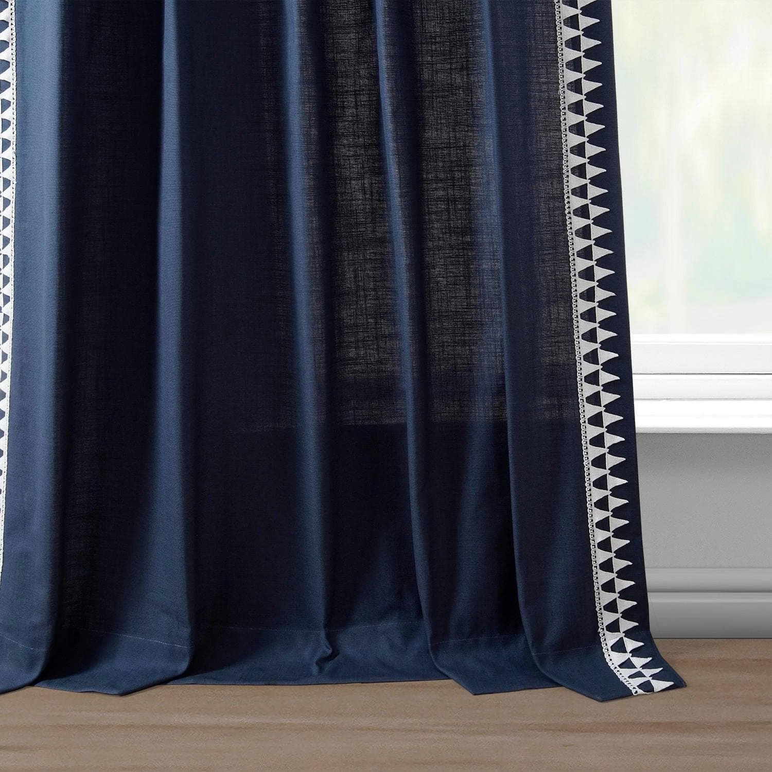 Blue Harbor is navy blue trimmed with contrasting white lace on both sides. This 100% cotton curtain has a refined texture, unlined, and has no backing.