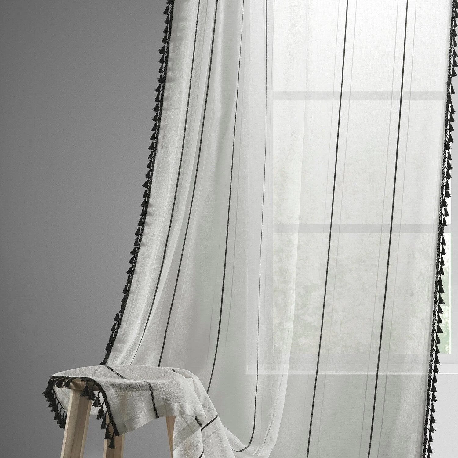 Campane is a classy unlined linen-like white semi-sheer curtain to create an ethereal atmosphere. Woven design detailing features an exquiste black pinstripe between two white stripes. The classic black bell-shaped tassle fringe is harmonious textural interest to emphasis length height and its modern twist. Easy to hang pole pocket with hook belt and back tabs.