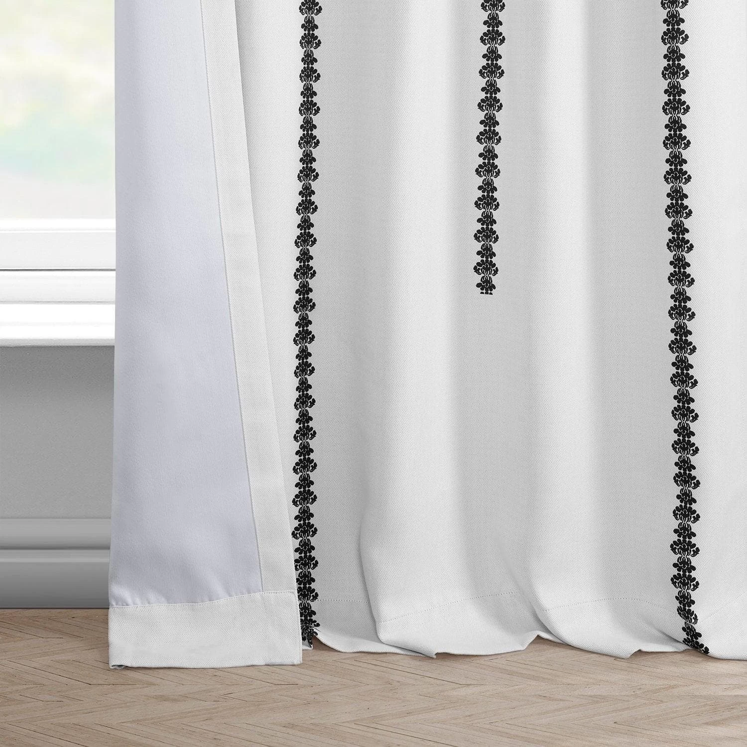 Cypress Black print is a curvy arabesque design in basic black on a off white background. This linen-look curtain is unlined and backed with off white fabric.
