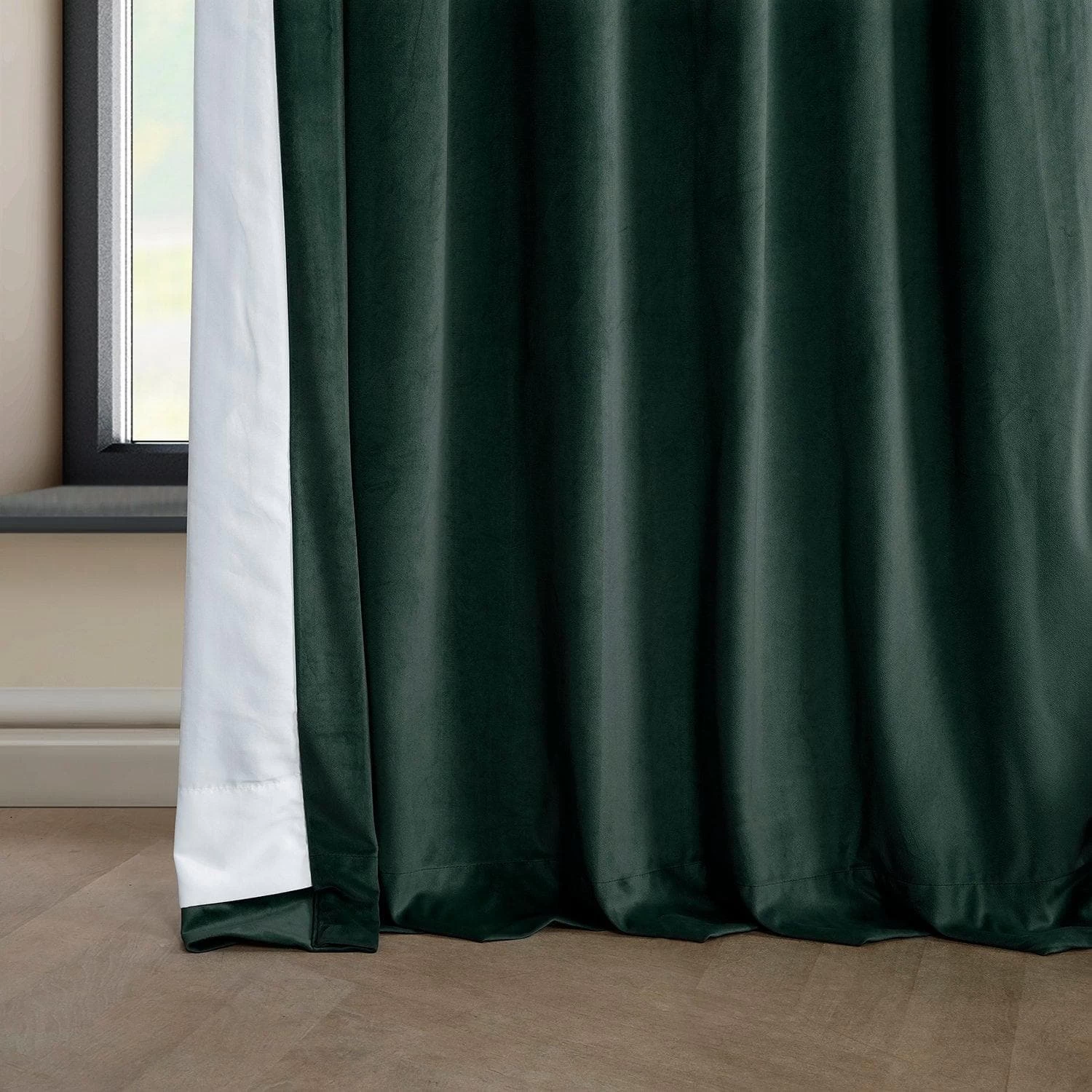 Heritage Forestry Green is an opulent deep green. This plush velvet curtain is lined with off white fabric.