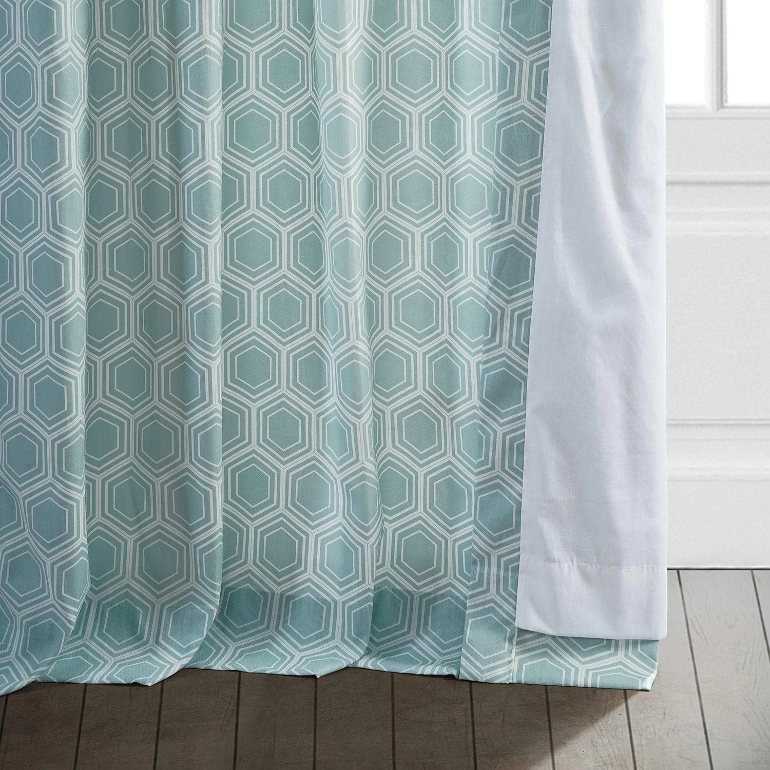 Honeycomb Ripple Aqua is a soft light twill drape & curtain, fully lined and geometric honeycomb backdrop to any space for anyone, family or worker-bee. A geometric honeycomb inspired print with concentric hexagonal shape and outlines in cool aqua blue pastel to softly brighten your space.