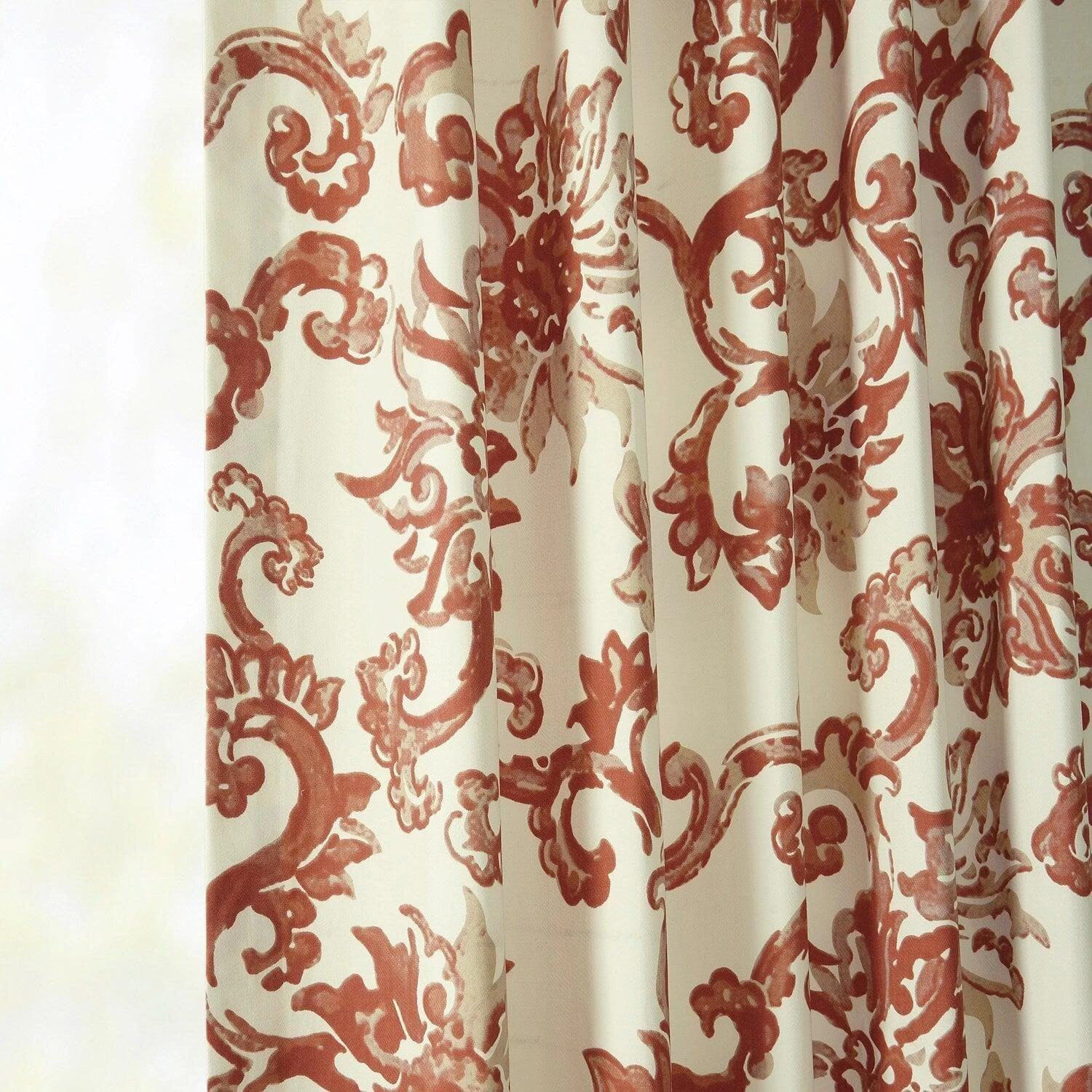Made To Order: Indonesian Rust is a pleated multi-tone rust color batik style floral print on a light beige background. This 100% cotton twill curtain is lined with off white fabric.