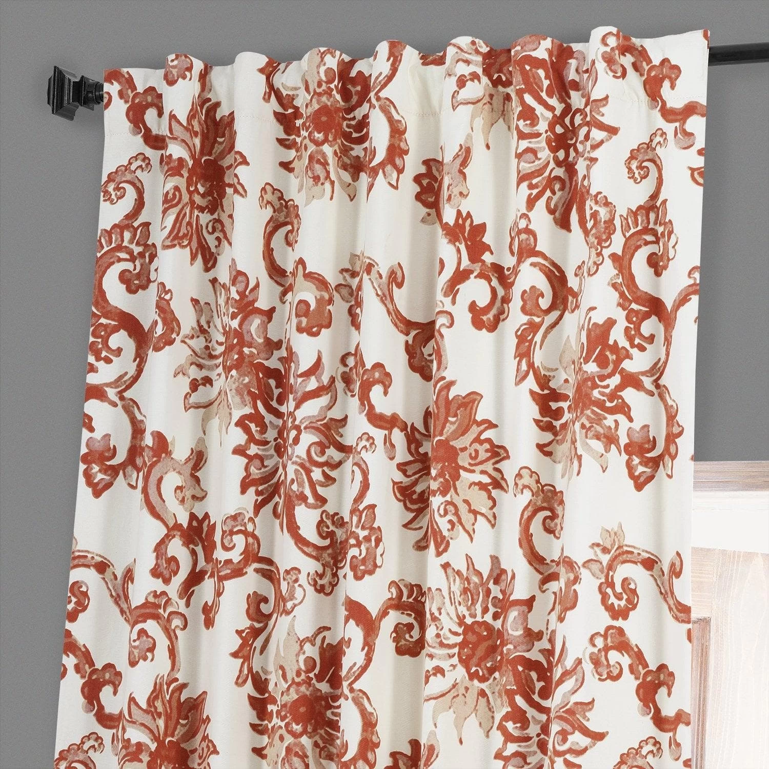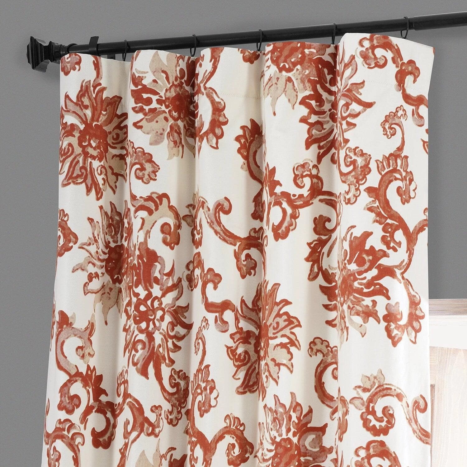 Indonesian Rust is a multi-tone rust color batik style floral print on a light beige background. This 100% cotton twill curtain is lined with off white blackout fabric.