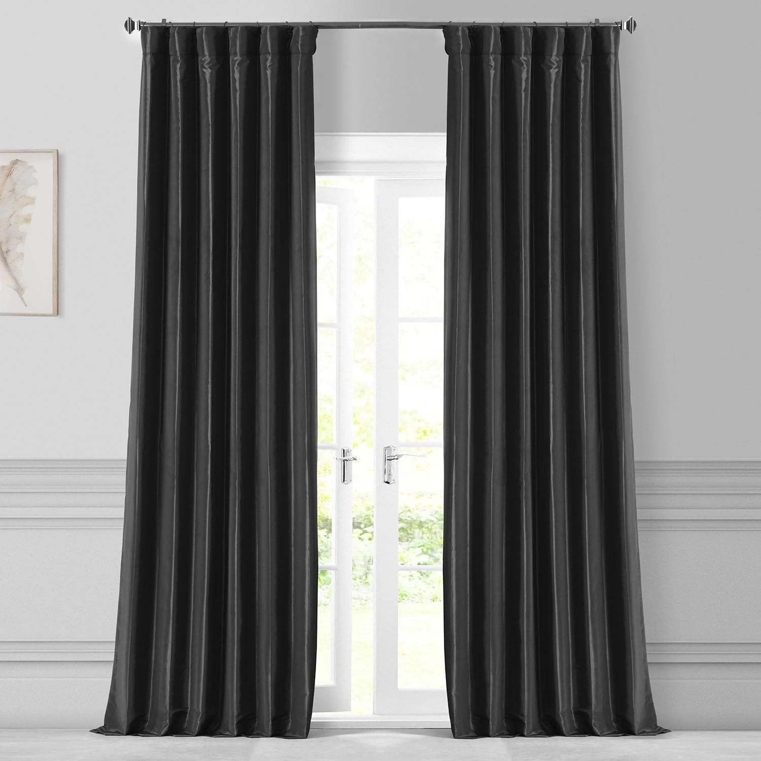 Jet Black is a lustrous jet black. This taffeta curtain is lined with off white fabric.