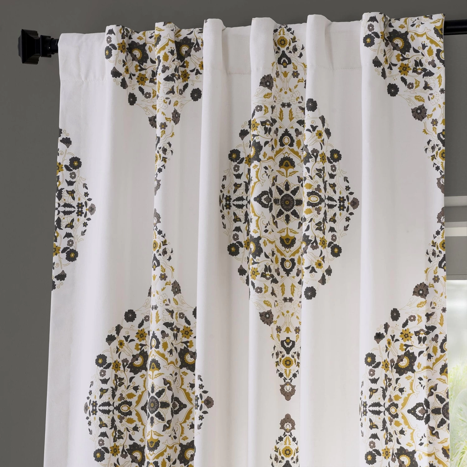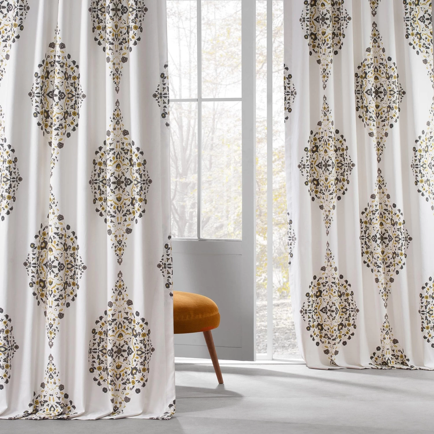 Kerala Gold is a mandala-style print with gold and grey details inside a light grey outline on an off white background. This 100% cotton twill curtain is lined with off white fabric.