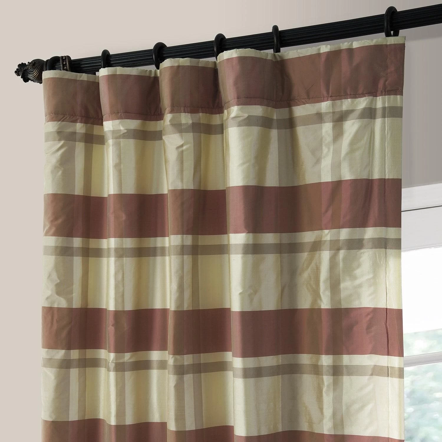 Mallur Ruby Plaid is a madras plaid in lustrous dark pink, taupe, and ivory. This 100% silk curtain from India is lined with off white fabric.