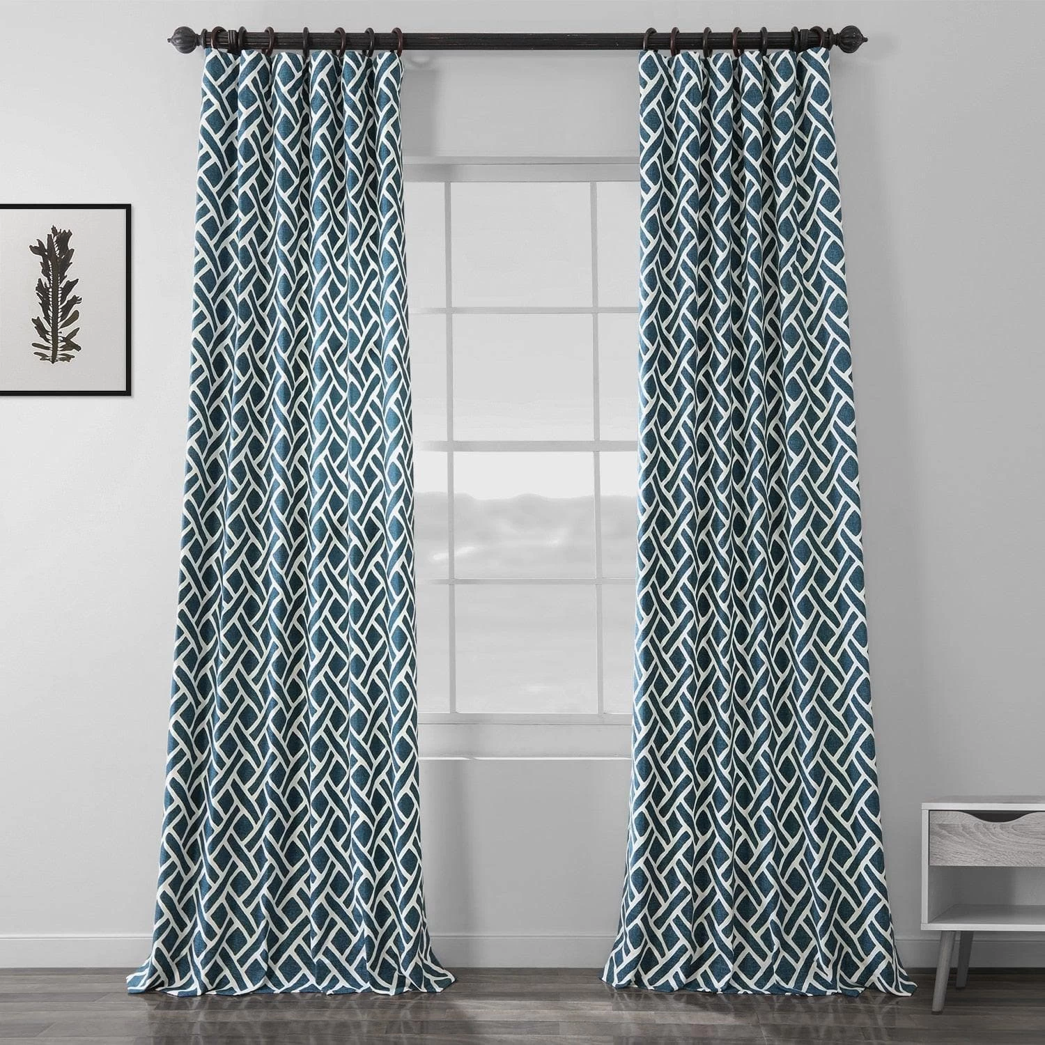 Martinique Blue is a basket weave print in teal blue on an off white background. This 100% cotton twill curtain is lined with off white fabric.