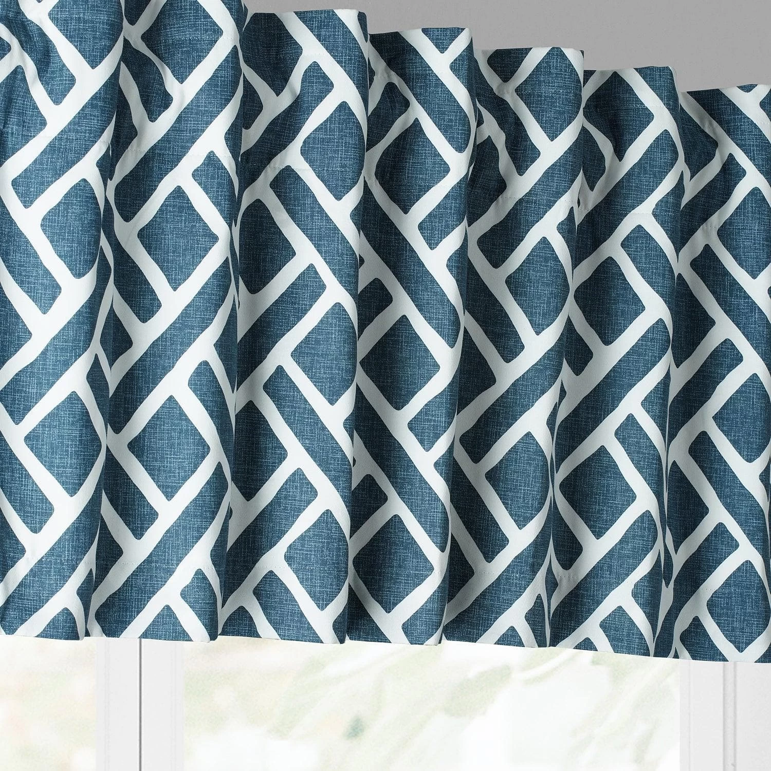 Martinique Blue is a basket weave print in teal blue on an off-white background. This 100% cotton twill window valance is lined with off-white fabric..