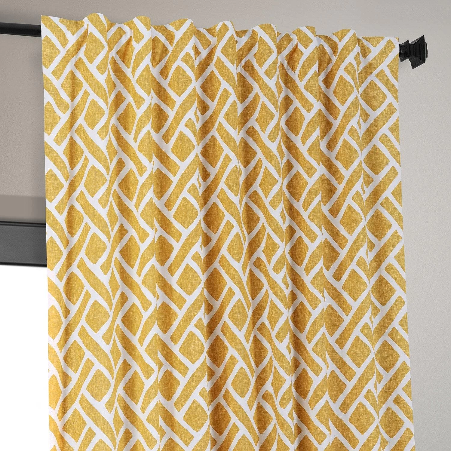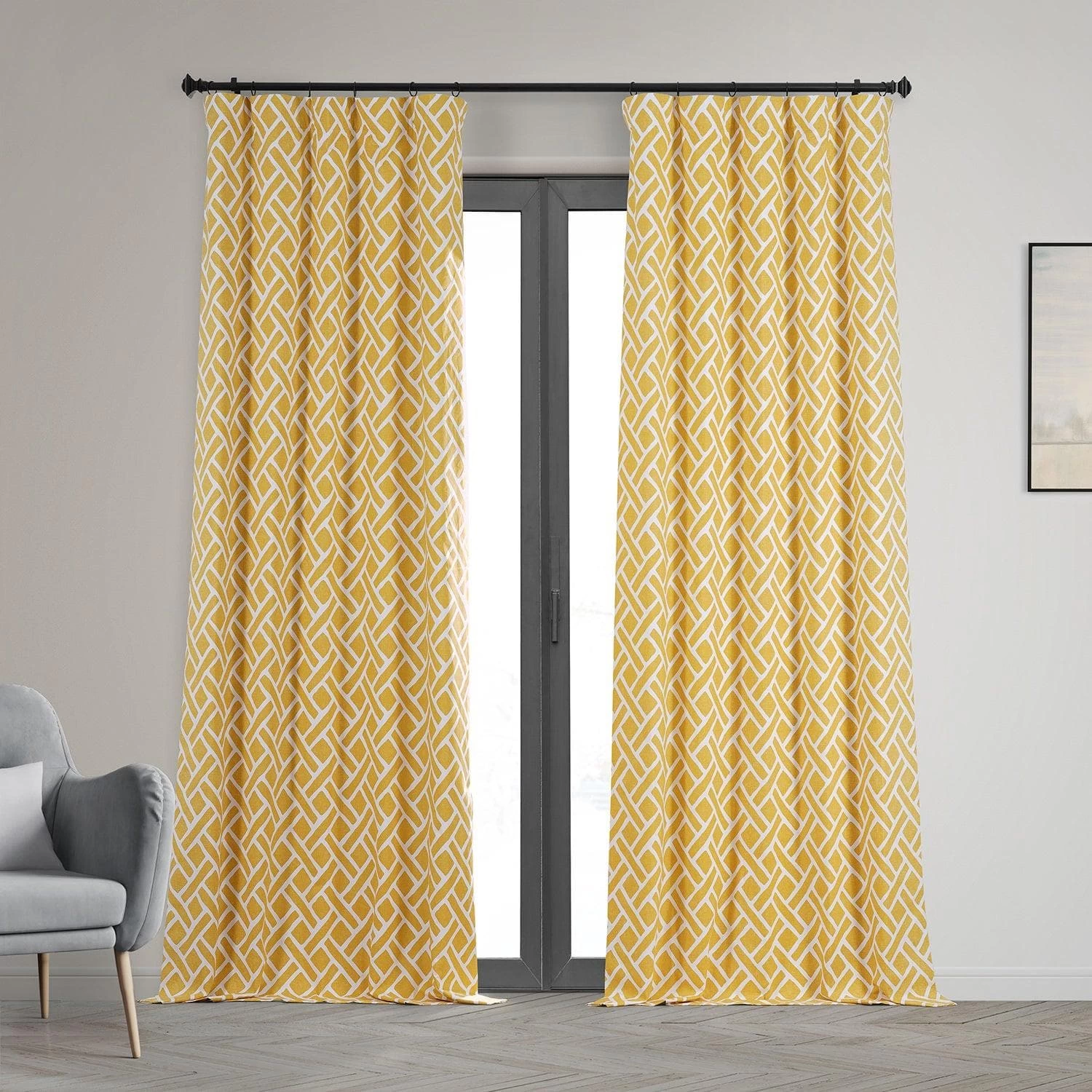 Martinique Yellow is a basket weave print in sunny yellow on an off white background. This 100% cotton twill curtain is lined with off white blackout fabric.
