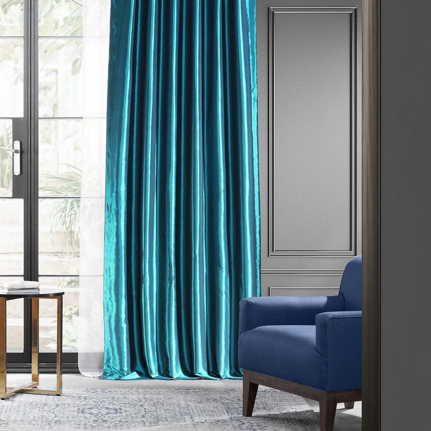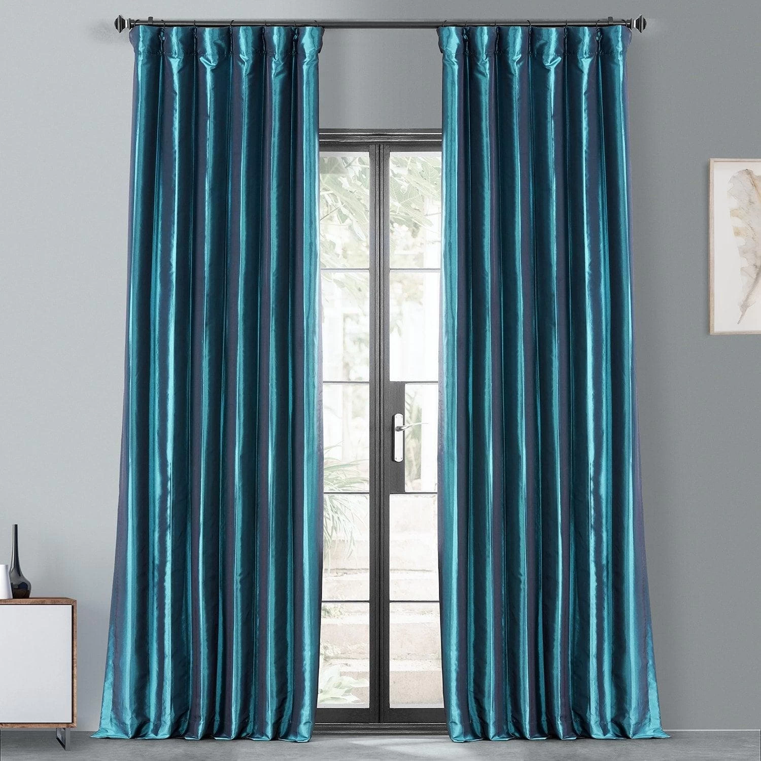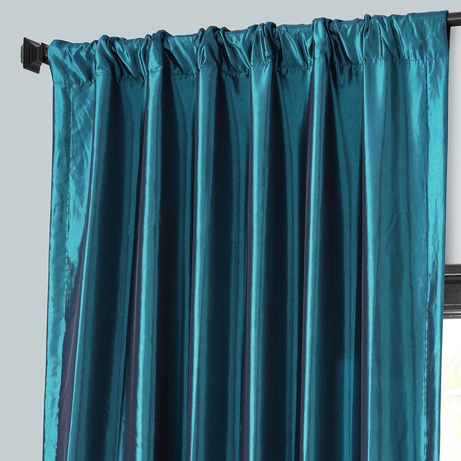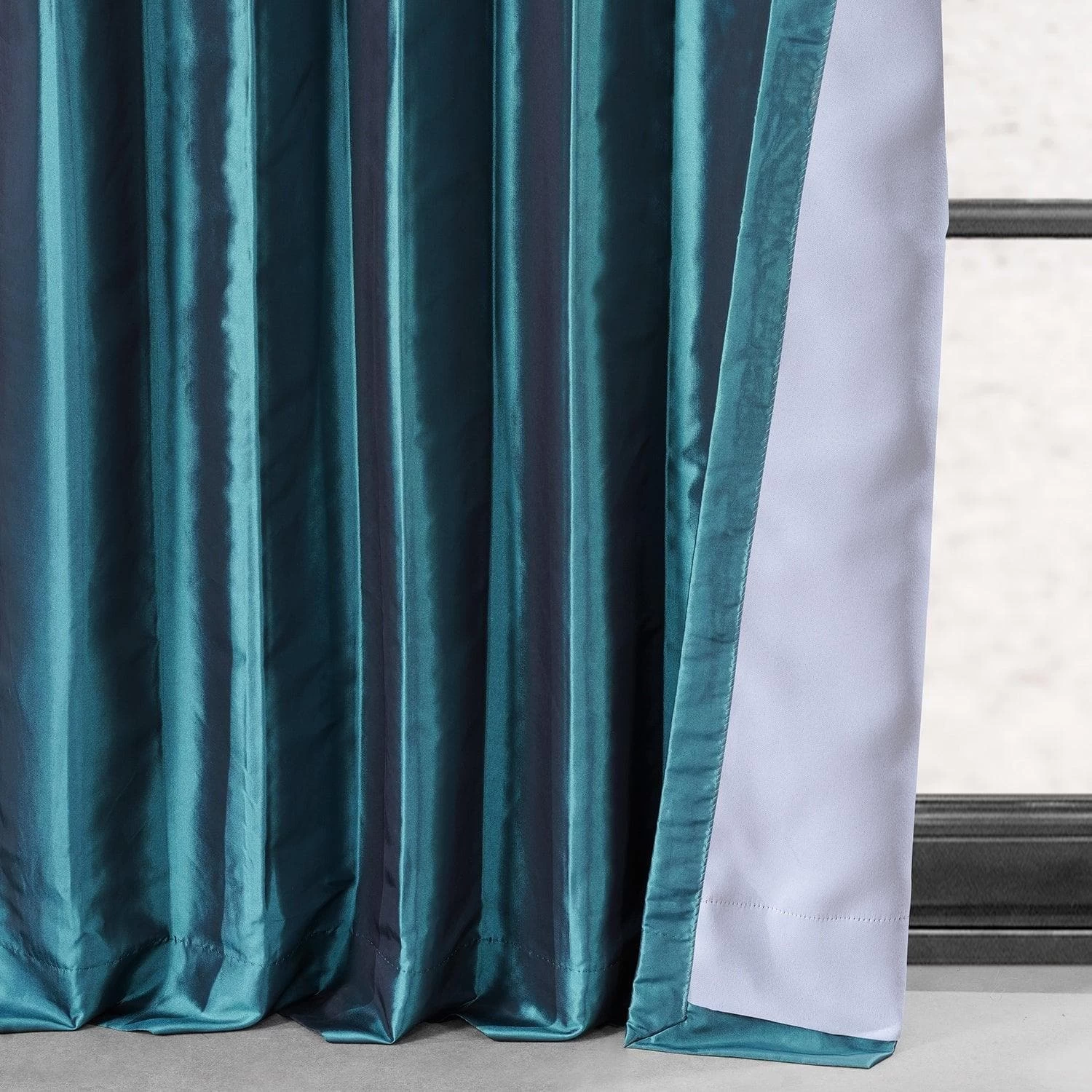 Meditteranean is a lustrous dark teal blue. This taffeta curtain is lined with off white blackout fabric.
