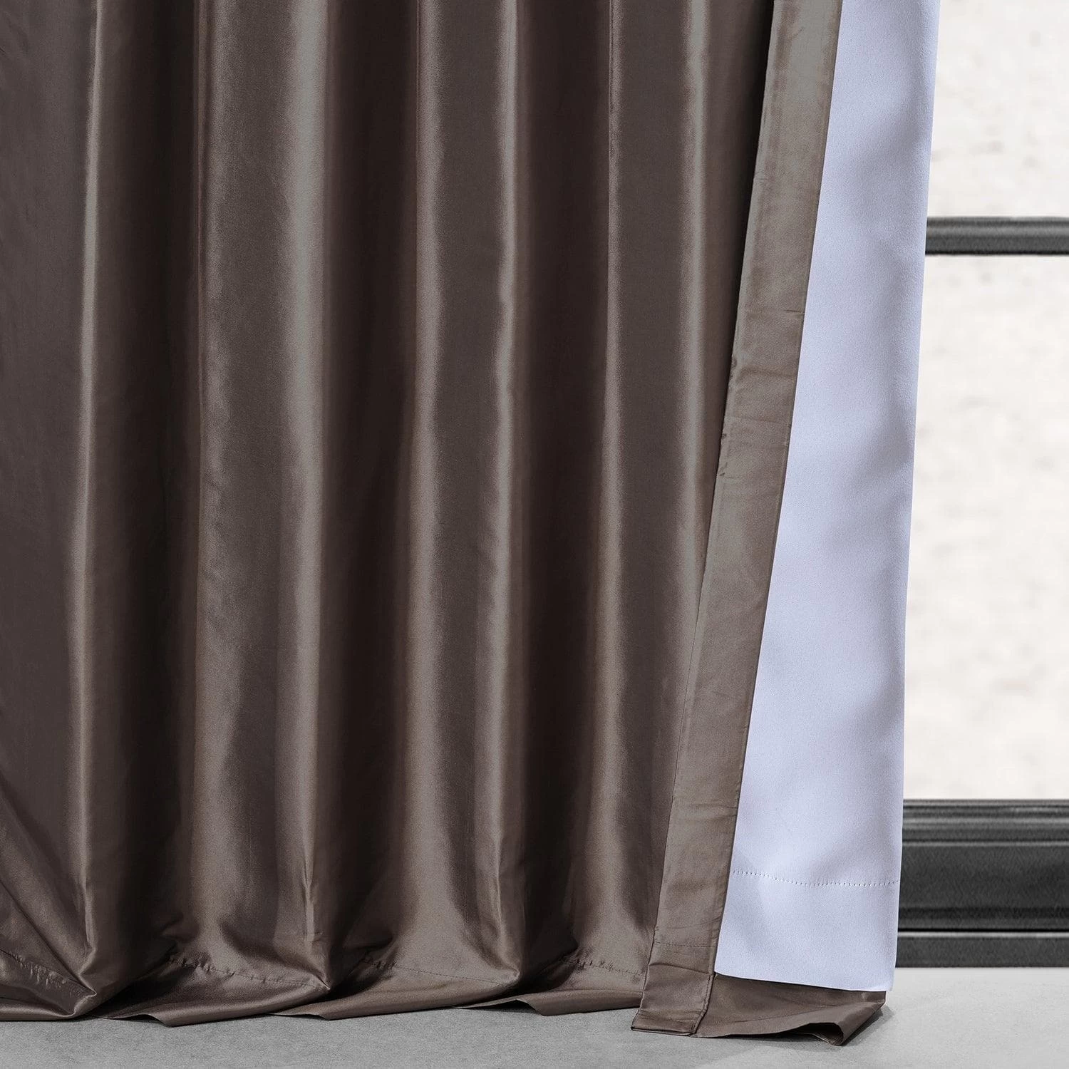 Mushroom is a lustrous dark copper brown. This taffeta curtain is lined with off white blackout fabric.