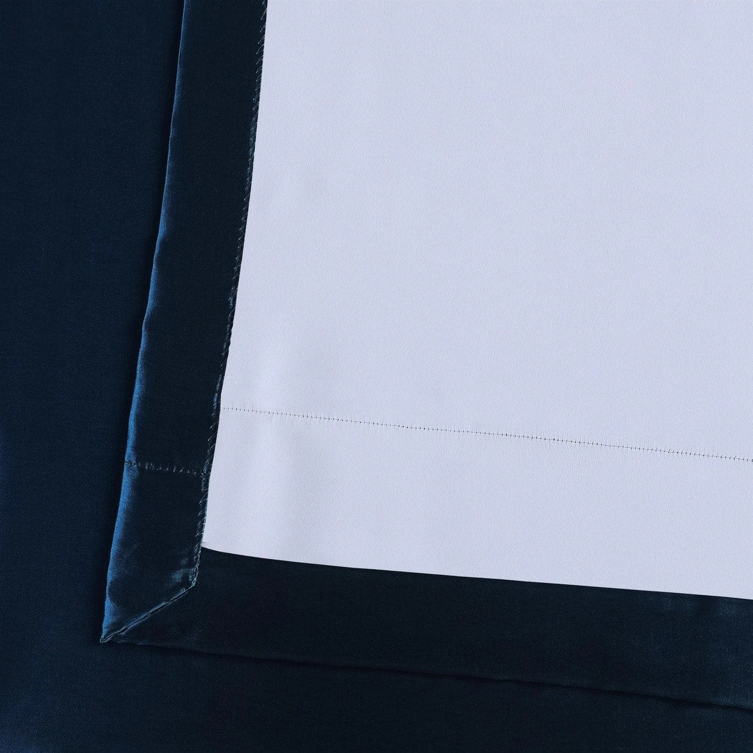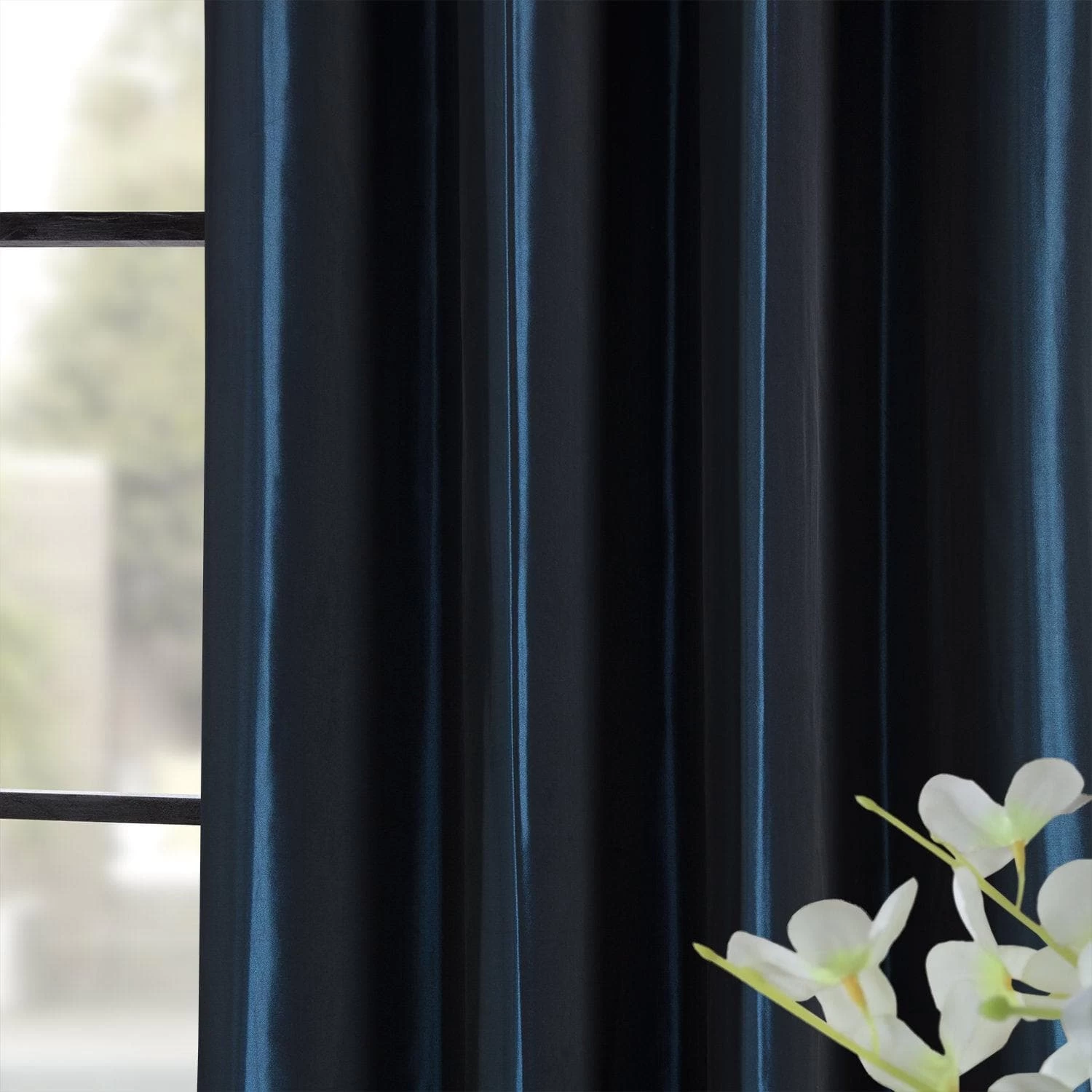 Navy Blue is a lustrous dark blue. This taffeta curtain is lined with off white blackout fabric.