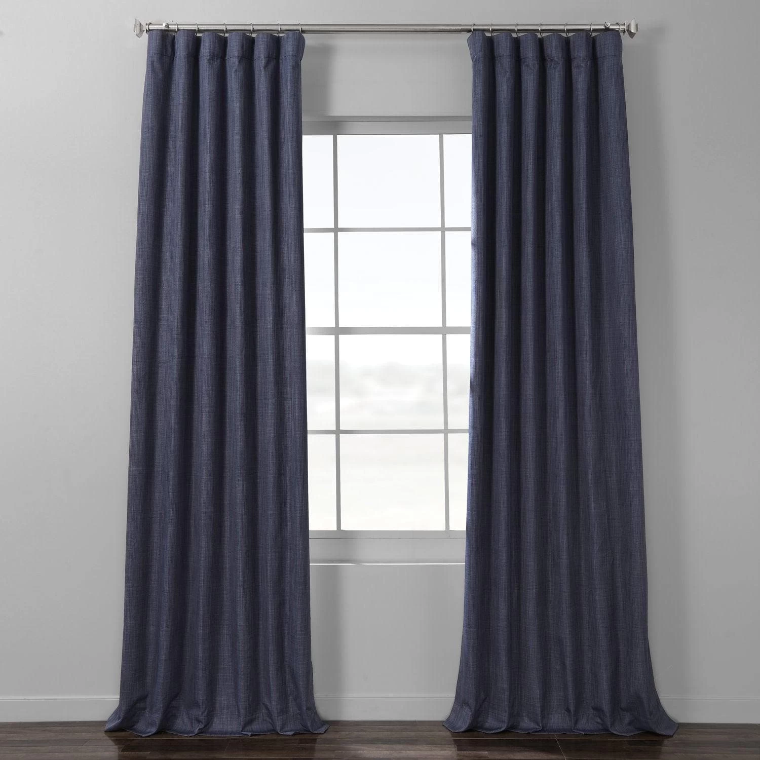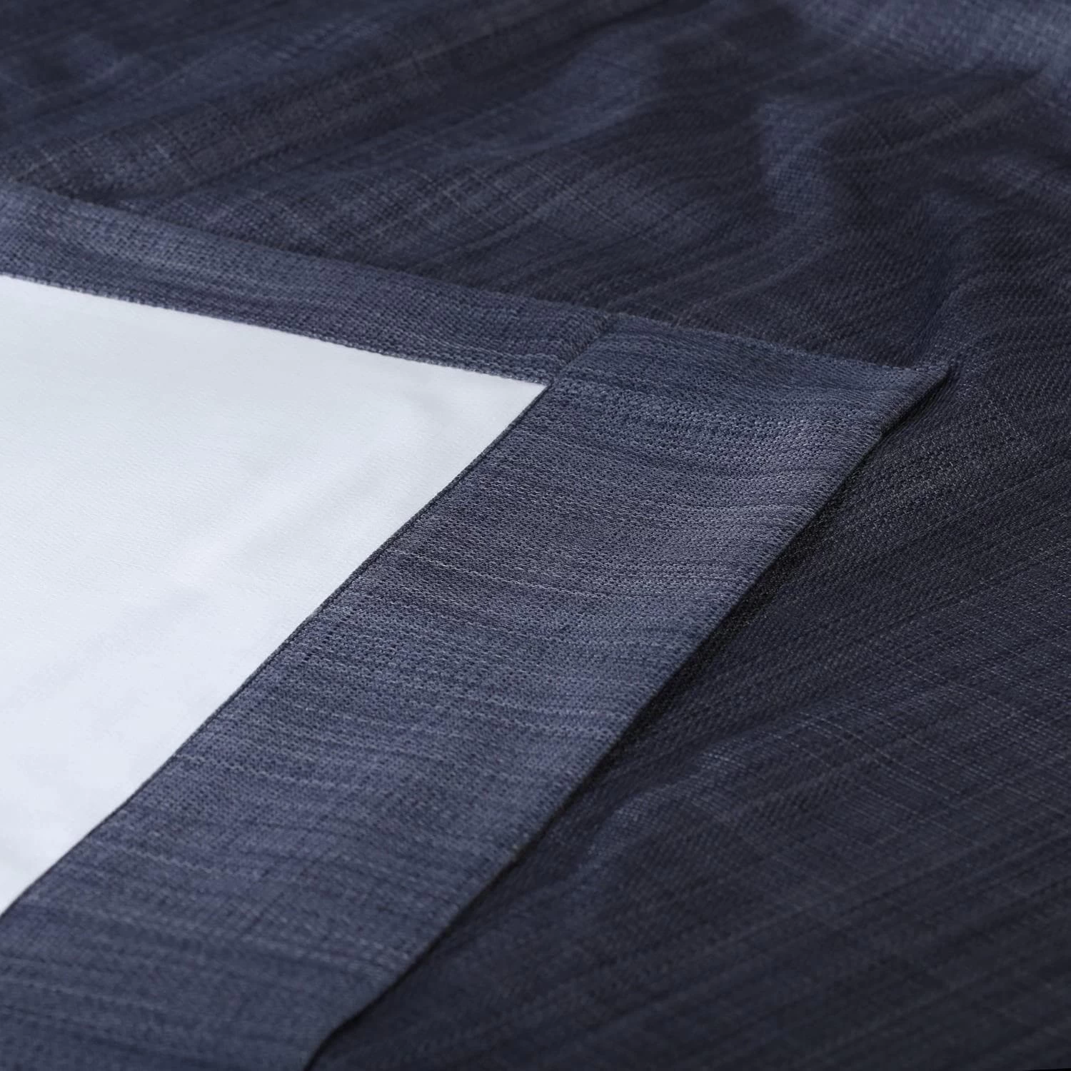 Pacific Blue Italian is a dark blue-on-blue crosshatch. This linen-look curtain is unlined and backed with coated off white fabric.