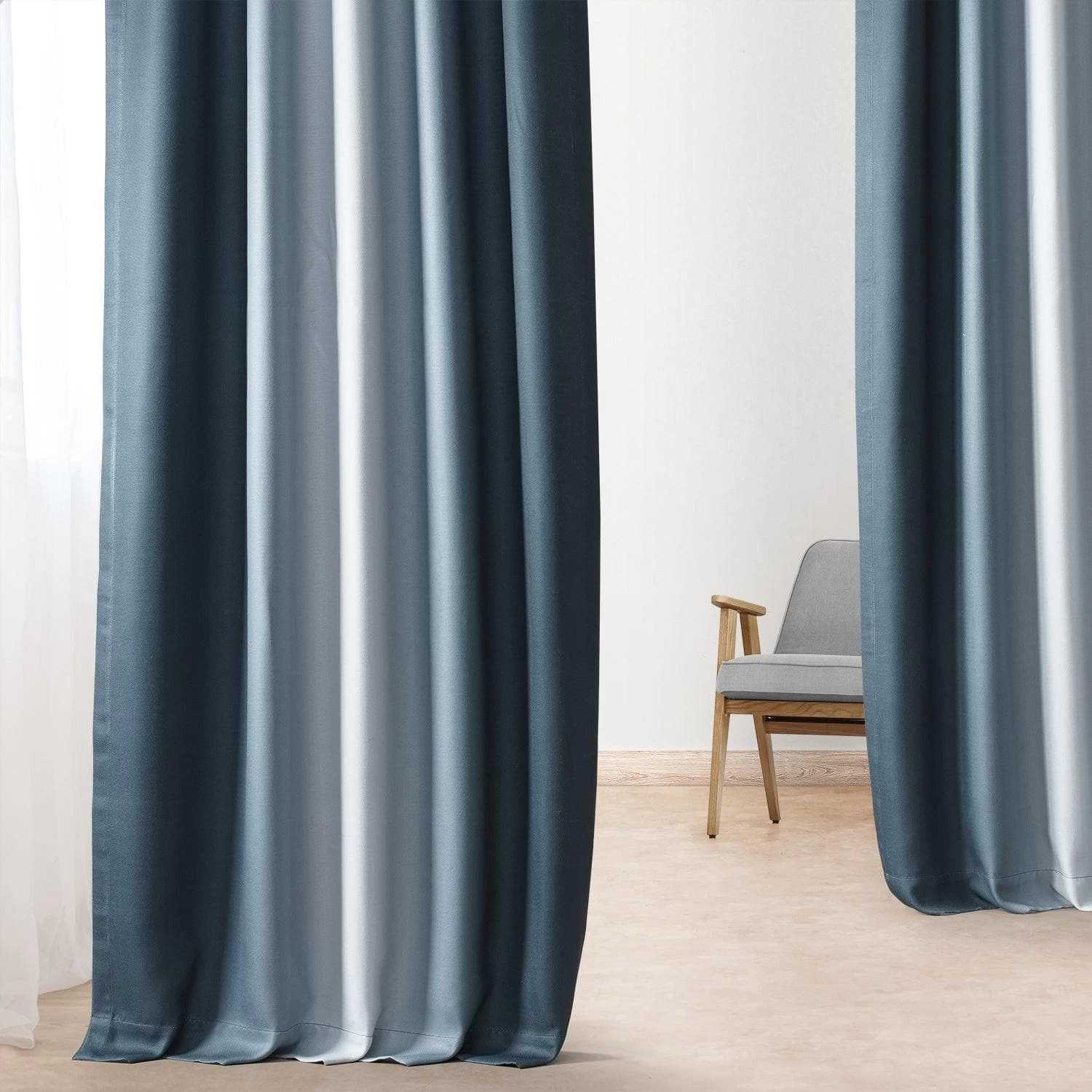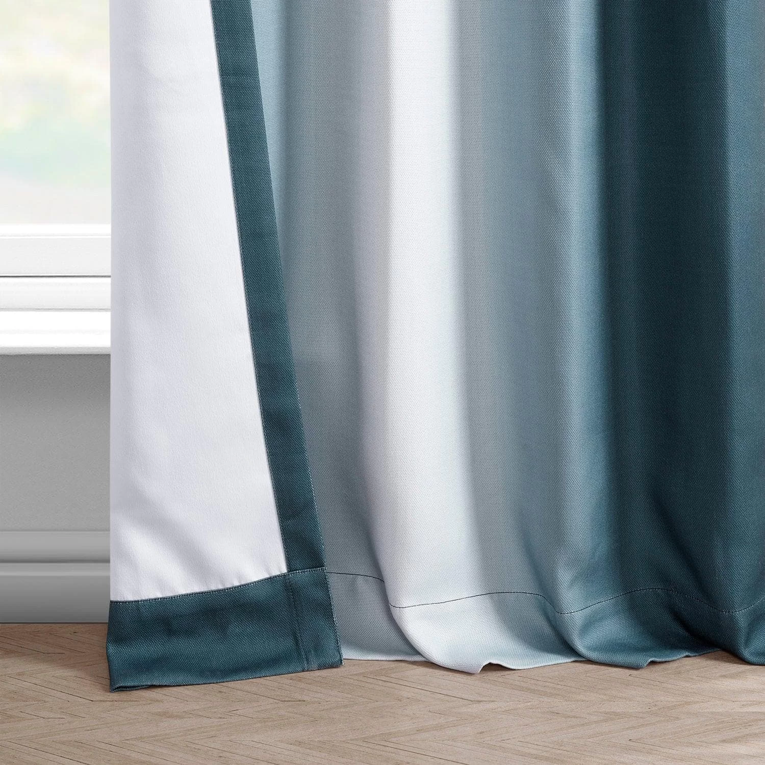 Parallel Teal is a tall ombre design fading teal to off white and fading back to teal. This linen-look curtain is unlined and backed with off white fabric.
