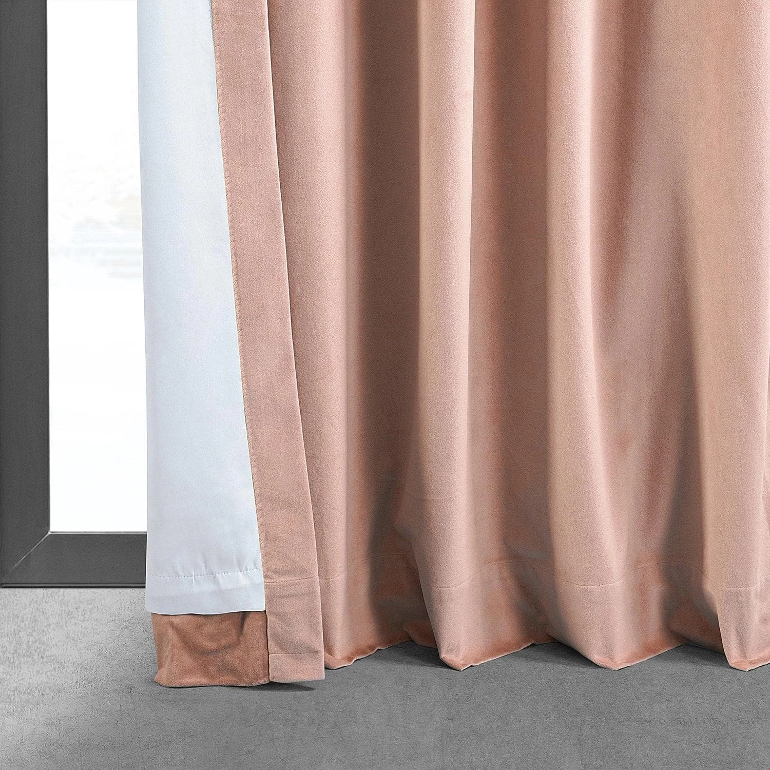 Rosey Dawn is a dewy soft pinky peach tone. This luxurious velvet curtain is lined with off white thermal fabric.