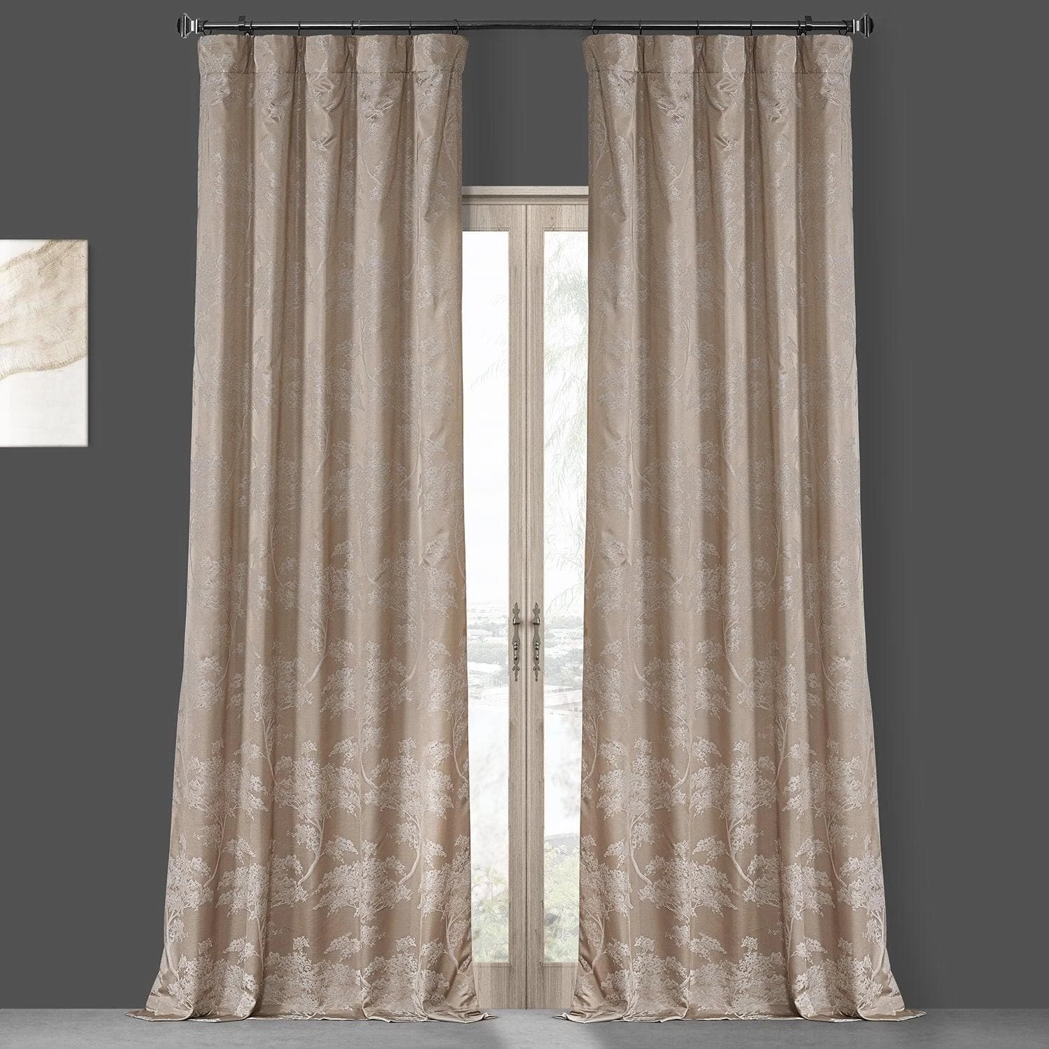 Sequoia Sand Beige is an elegant metallic silver and beige woven tree motif on a gold taupe background. This silk-look Jacquard curtain has a luxurious sheen and is lined with off white fabric.