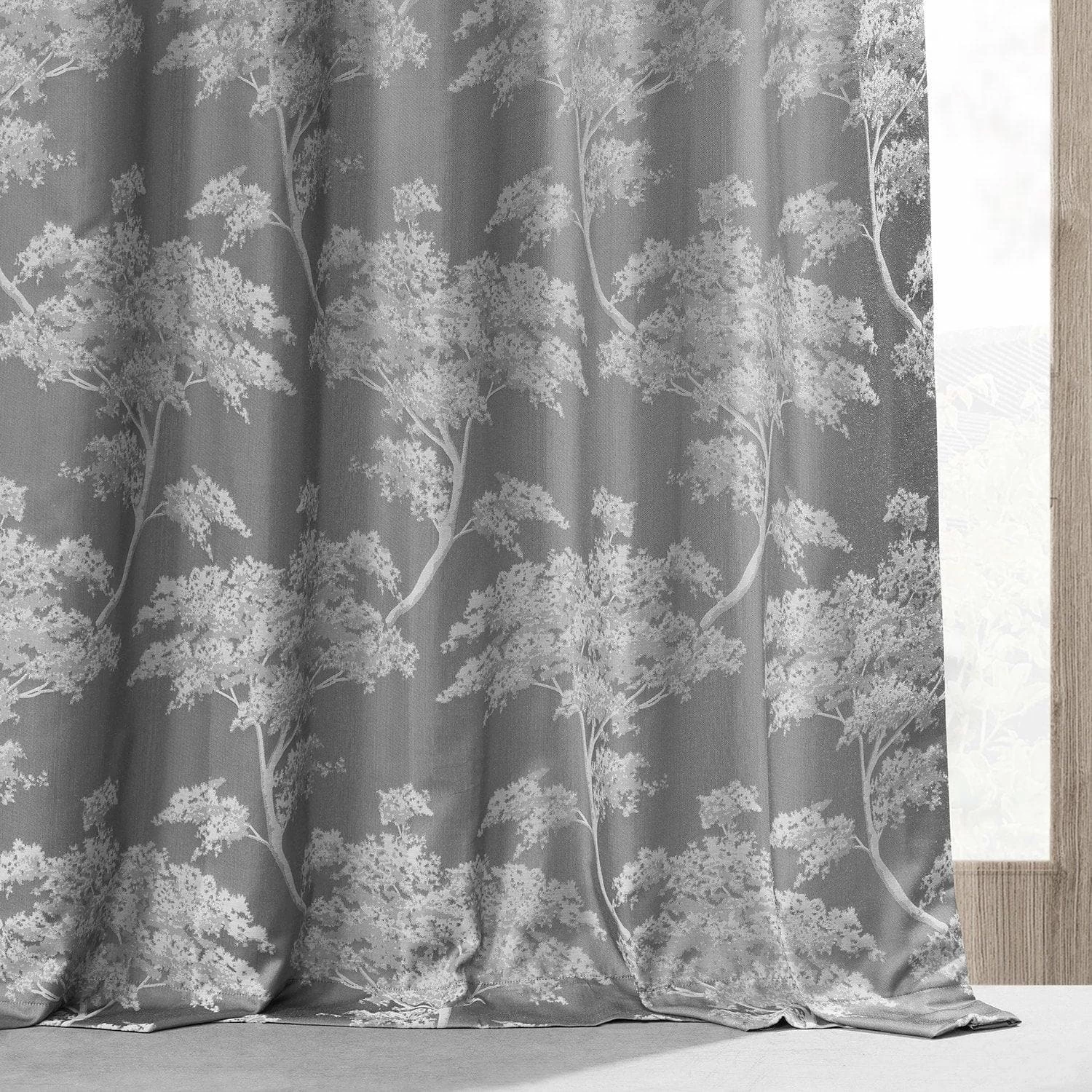 Sequoia Silver Grey is an elegant metallic silver and light grey woven tree motif on a silvery grey background. This silk-look Jacquard curtain has a luxurious sheen and is lined with off white fabric