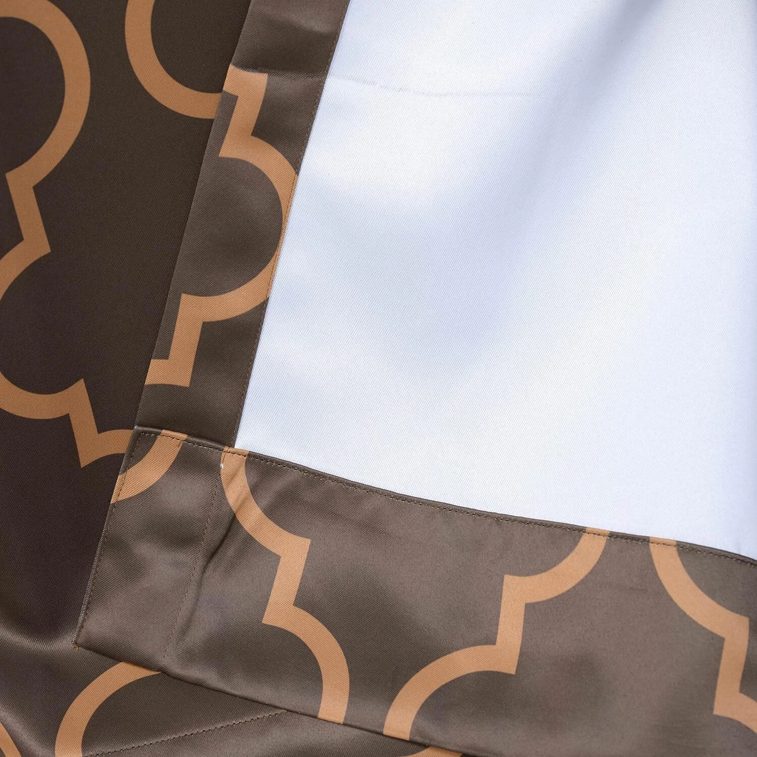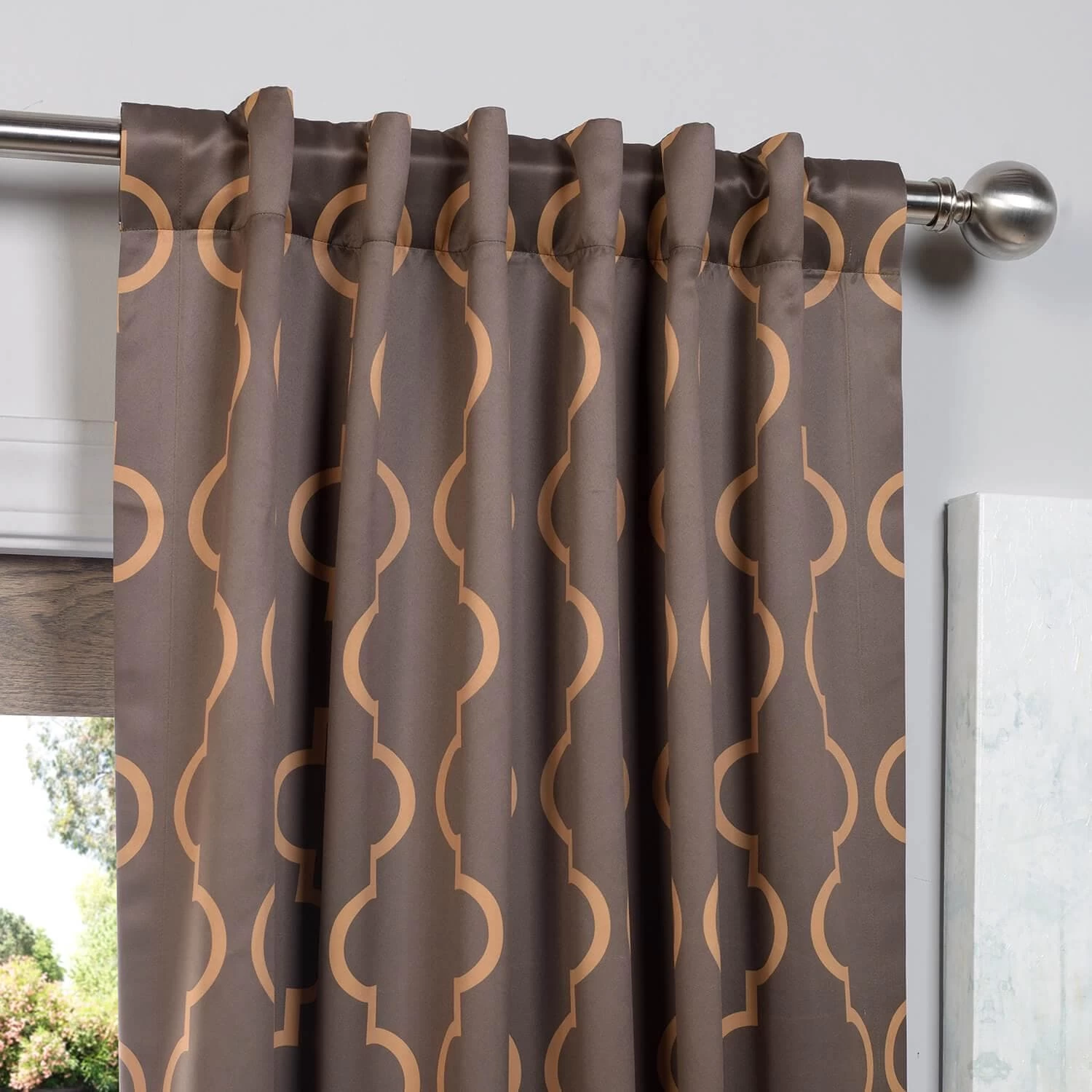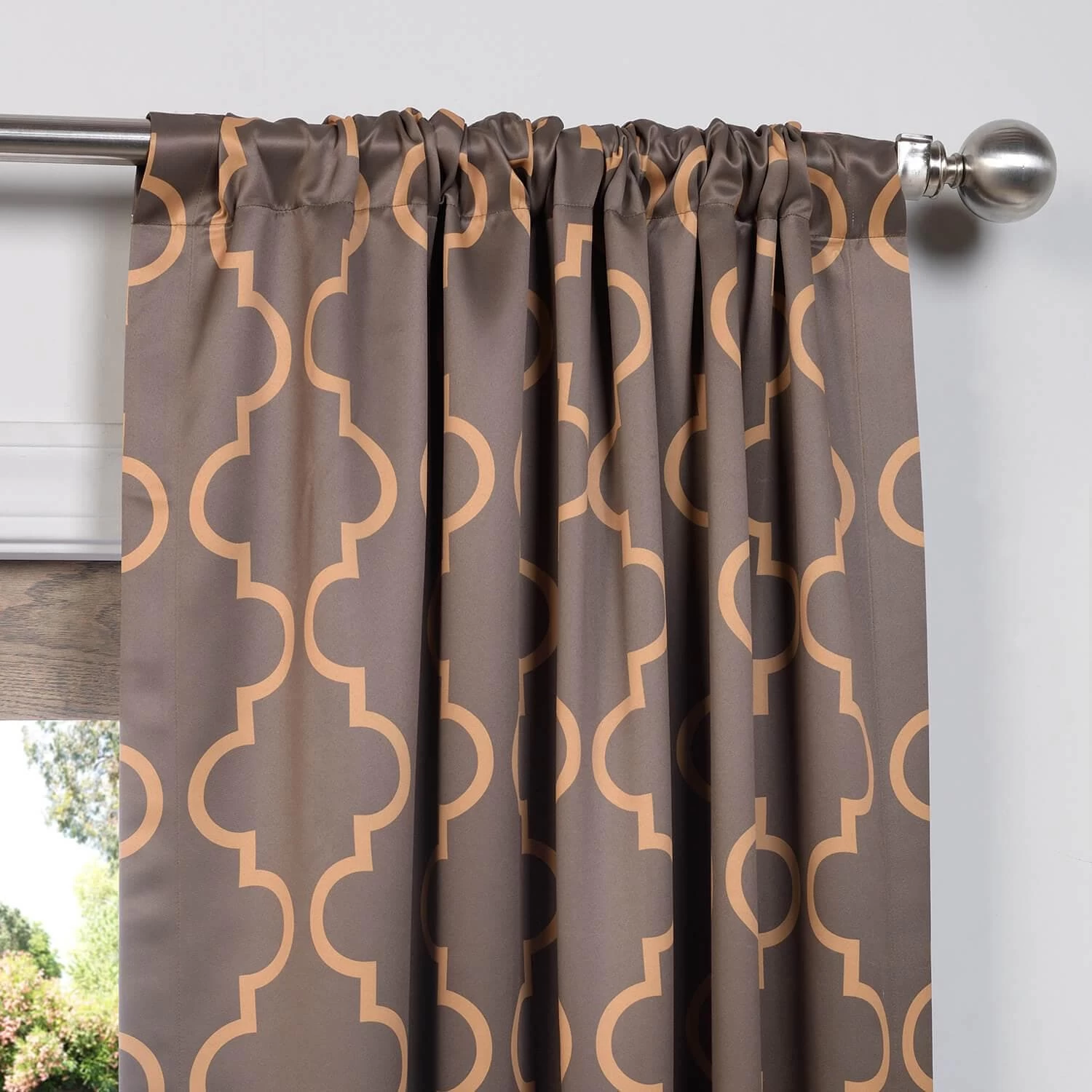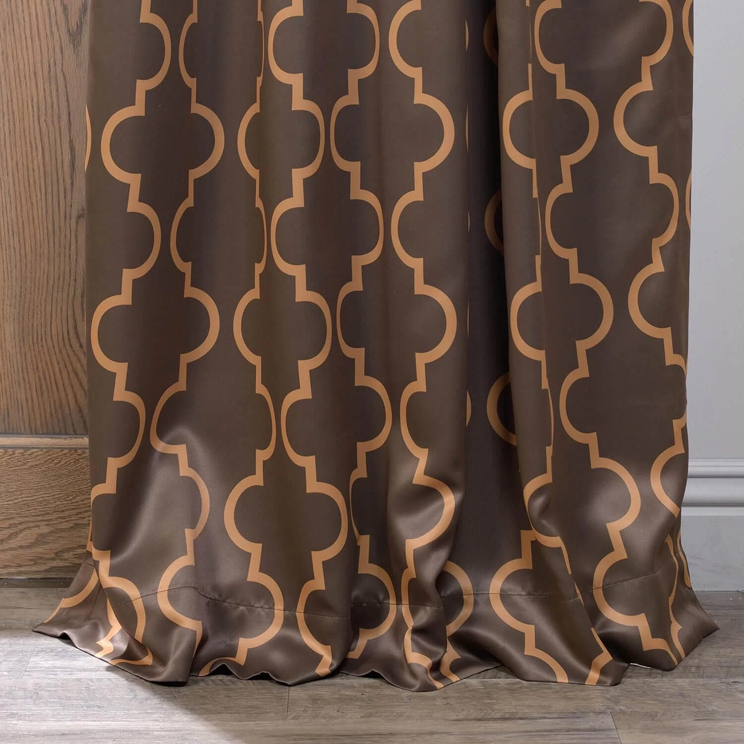 Seville Taupe & Gold is an Andalusia-inspired lattice design on a brown background. This smooth curtain is unlined and backed with off-white fabric