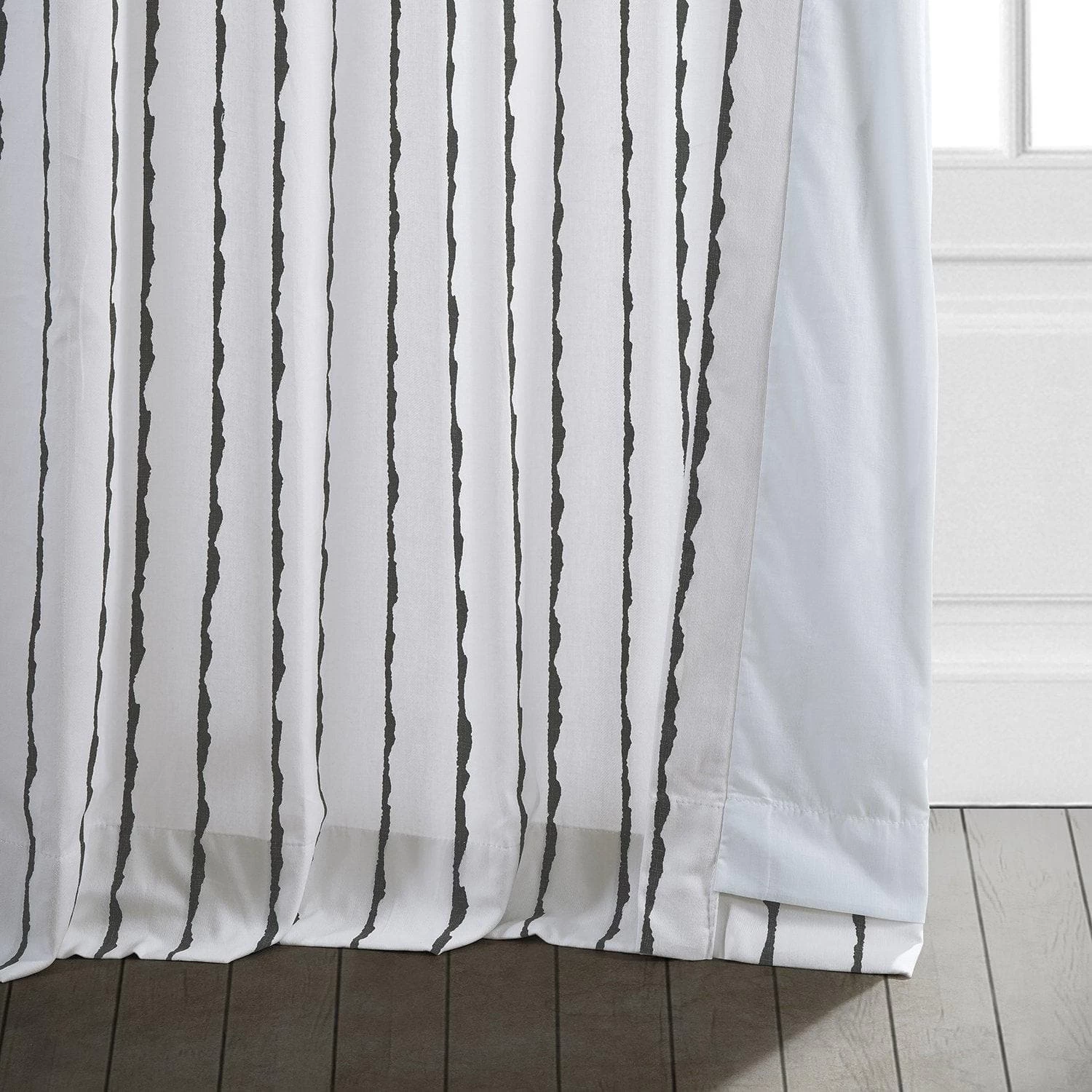 Sharkskin Black Stripe is a soft light twill printed drape & curtain, fully lined and a contemporay thin stripe in basic black & white. The wide white space between the thinner deckle edge stripes reminds us of black pinstripe detailing. Look closely to see a white cross-hatch throughout the deckle edge black stripe.