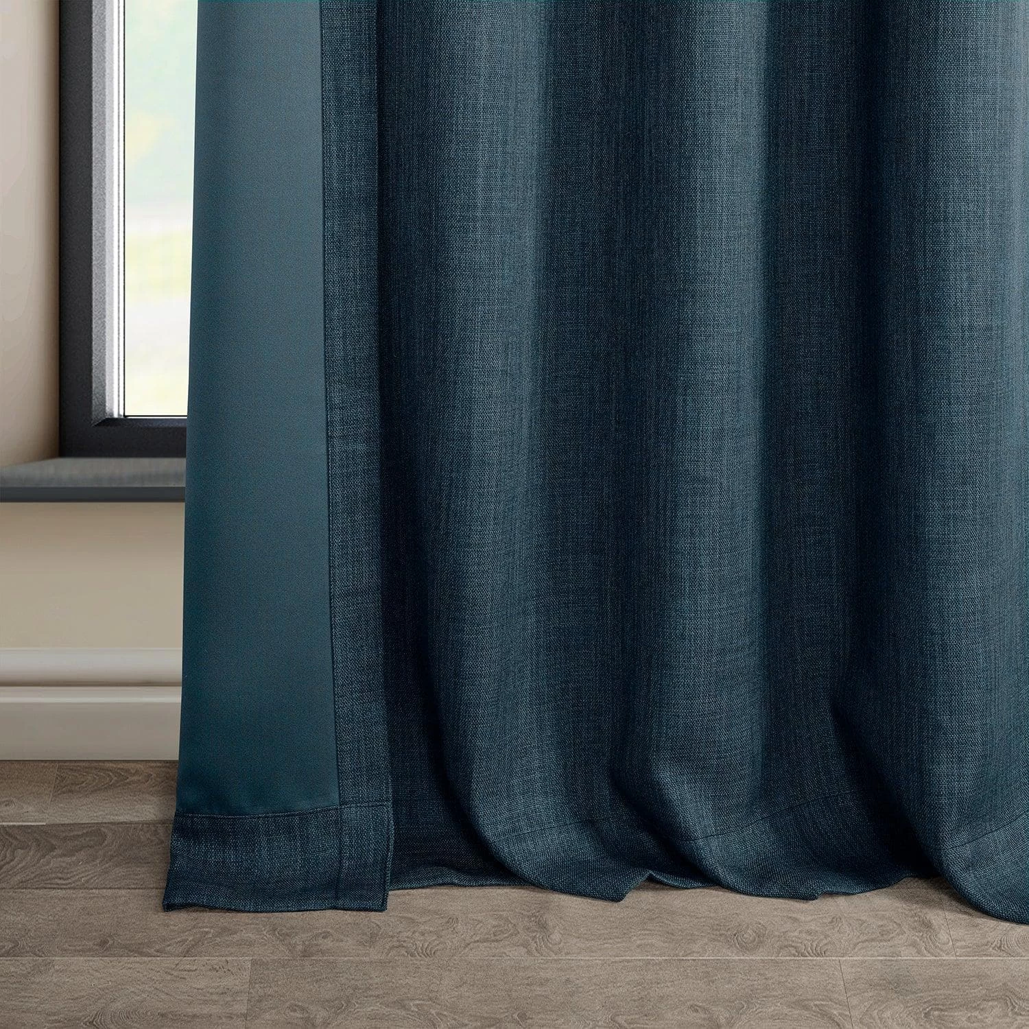 Story Blue is a deep denim and dark blue crosshatch. This linen-look curtain is unlined and backed with smooth dark blue fabric.