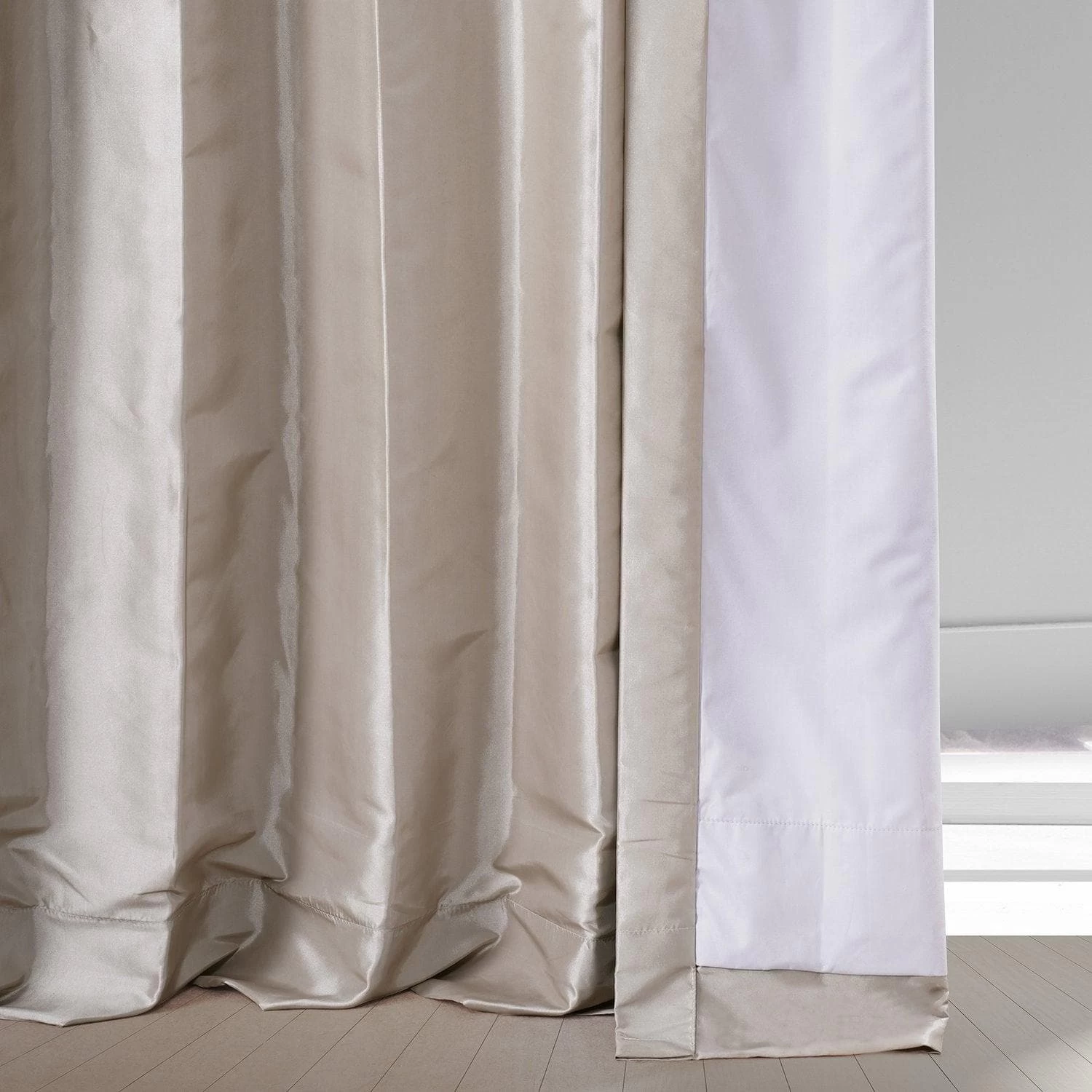 Virtual Beige is light beige. This taffeta curtain is lined with off white blackout fabric.